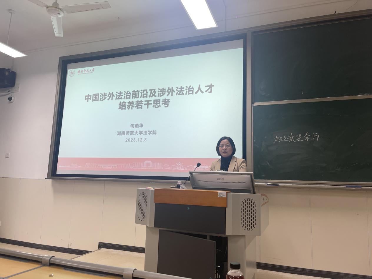 为落实育人育才培训理念,进一步提升教师教学水平、专业水平和教学实践应用能力,确保教学质量。2023年12月8日下午3点,人文艺术学院法律系在第十二教学楼209教室举办了以“中国涉外法治前沿及涉外法治人才培养若干思考”为主题的培训,此次培训由人文艺术学院法律系特邀湖南师范大学法学院副院长何燕华教授主讲。