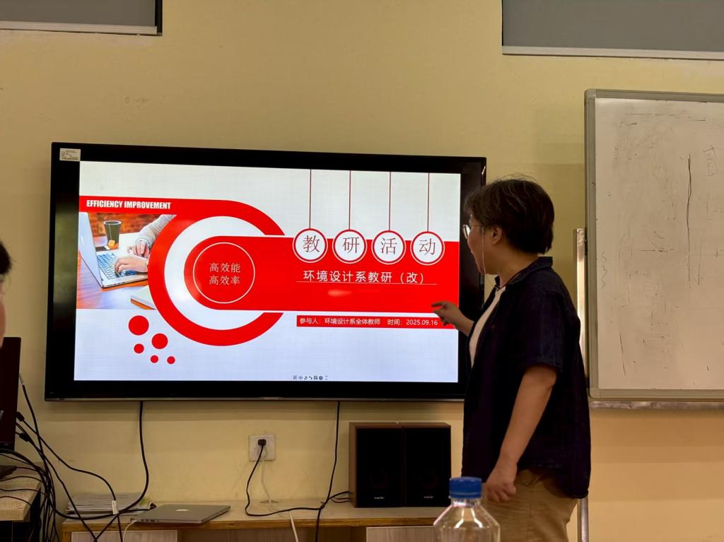 2025 年 9 月 16 日下午 15:00-16:00,环境设计专业系全体教师在第十一教学楼 309 教室召开教研(改)活动。本次活动以 “高效能、高效率” 为主题,由系主任李麟主讲,全程紧扣 “立德树人” 根本任务,围绕 “深化教学改革、提升师资水平、强化专业特色、服务学生成长” 四大核心目标,通过创新形式、聚焦实质、强化产出的方式,有效激发教师参与热情,显著提升教研活动质量,为后续专业教学改革、教师发展与人才培养工作明确了方向。