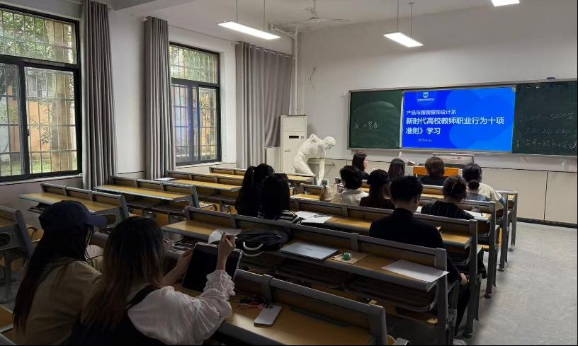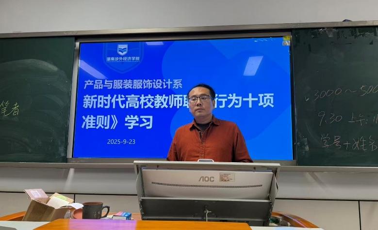 2025年9月23日下午2:30,产品与服装服饰设计系全体教师成功举行了一场主题鲜明、内涵深刻的系部教研活动。本次活动围绕《新时代高校教师职业行为十项准则》展开深入学习与研讨,旨在进一步加强师德师风建设,提升教师队伍的政治素养和职业道德水平,推动教育教学高质量发展。全体系部教师积极参与,现场氛围庄重而热烈。