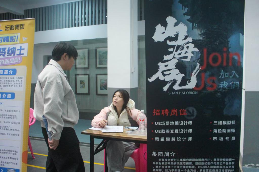 双选会现场气氛热烈,各企业展位前人头攒动。从下午两点开始,学生会志愿者便配合学院就业办完成了场地布置、企业资料摆放等准备工作;活动启动后,企业招聘负责人通过宣传手册、项目案例演示、现场作品点评等方式,直观展示岗位需求与职业发展前景,不少设计类企业还现场开展了“10分钟快题测试”,让学生的专业能力得到即时展现。