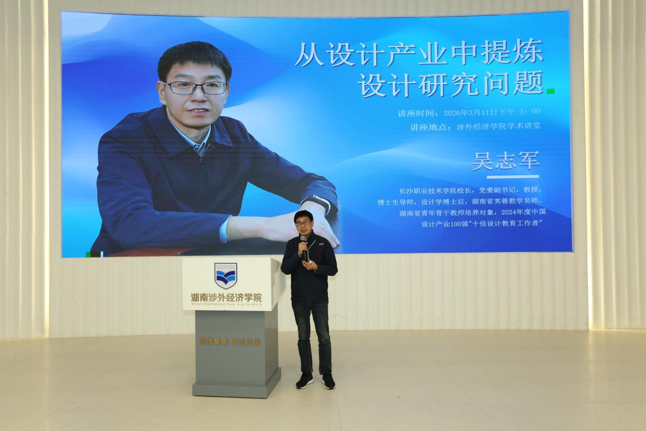 2026年3月11日下午3时,由人文艺术学院主办的专题讲座“从设计产业中提炼设计研究问题”在学术讲堂顺利举行。本次讲座特邀长沙职业技术学院校长、党委副书记吴志军教授担任主讲人,产品与服装服饰设计系、视觉传达与环境艺术设计系、数字媒体艺术系全体教师到场聆听。