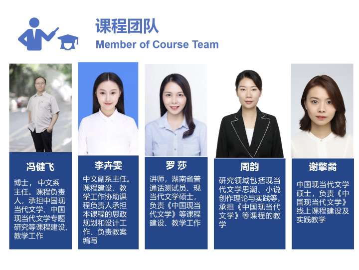 (1)本教学团队负责人文艺术学院汉语言文学专业中国现当代文学课程的全部教学任务。包括中国现当代文学(一)、中国现当代文学(二)、中国现当代文学专题研究等相关课程;