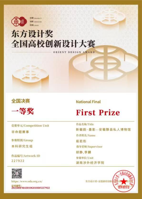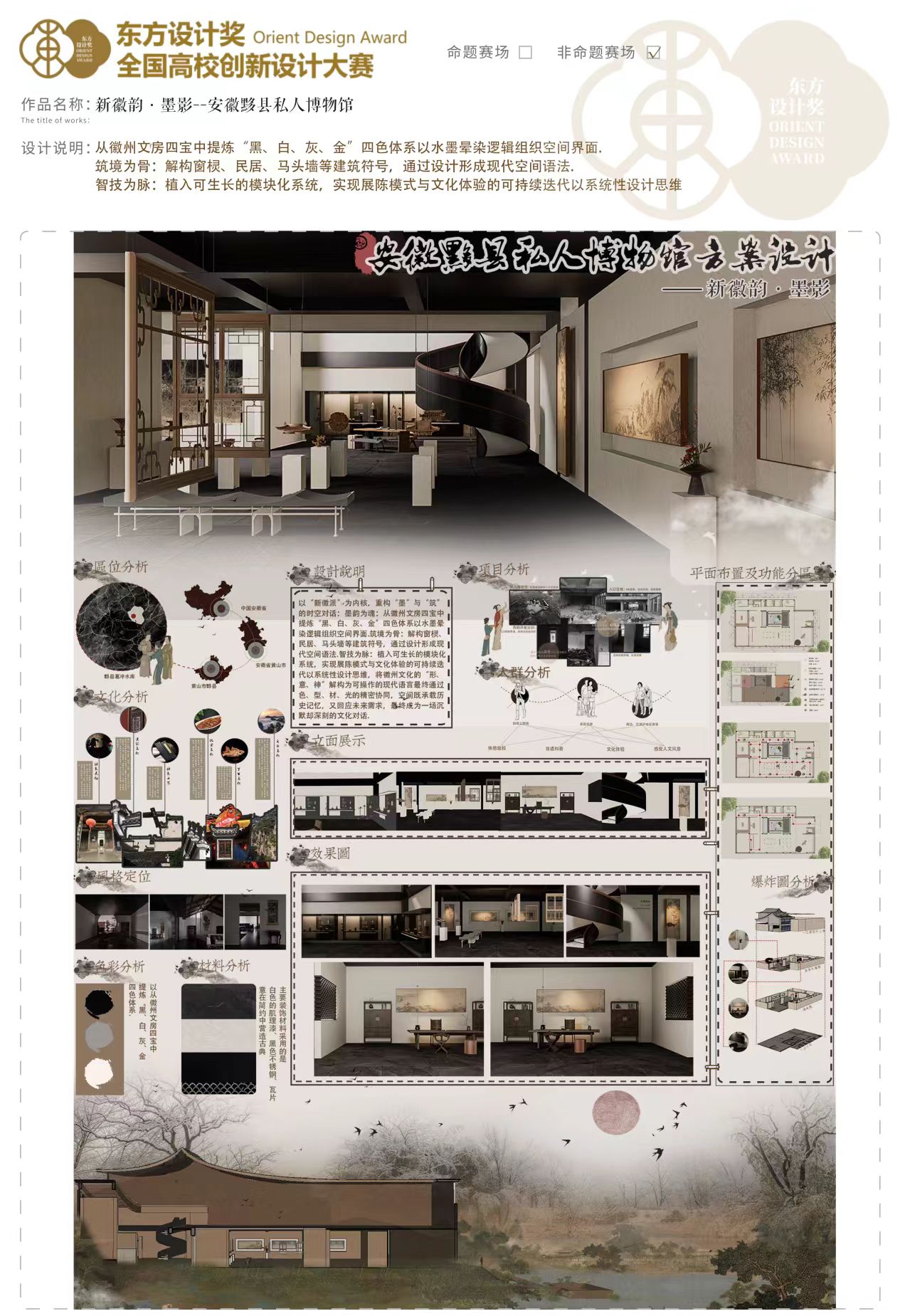 国家级赛事:在全国高校激烈角逐中突围,拿下12项国家级奖项,含一等奖3名、二等奖3名、三等奖6名,其中胡静、李麟老师带领学生完成的《新徽韵・墨影 —— 安徽黟县私人博物馆》项目,凭借 “文化性与实用性深度兼具、创新性与技术性高度融合” 的鲜明特色,不仅赢得评委高度评价,更成为学校“产—学—研”一体化办学宗旨的生动实践。