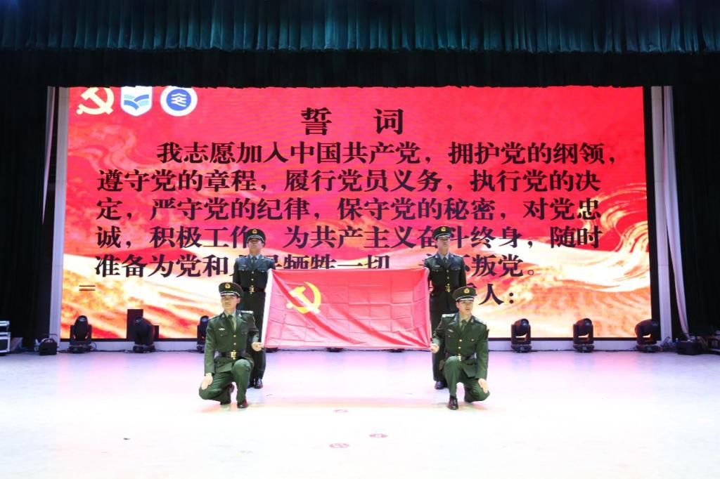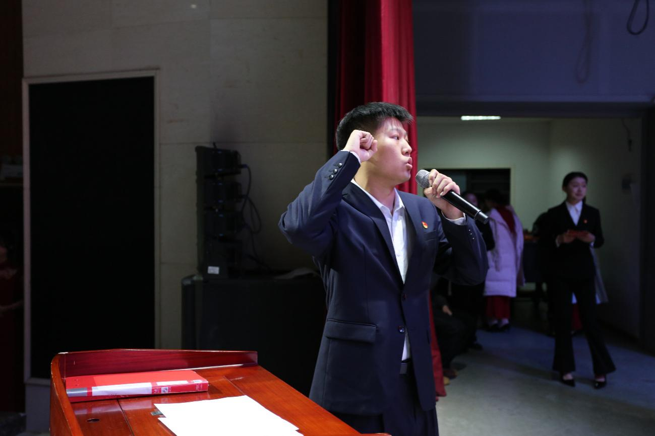 表彰环节结束后,大会进入预备党员宣誓议程。全体人员起立奏唱《国际歌》,激昂的旋律传递着坚定的理想信念。在党员代表孟哲帆的带领下,新发展的预备党员整齐列队、举起右拳,面向党旗庄严宣誓。“我志愿加入中国共产党,拥护党的纲领,遵守党的章程……”铮铮誓言铿锵有力、掷地有声,既是对党的忠诚承诺,也是对初心使命的坚定坚守,充分展现了新一代党员的责任担当与昂扬风貌。