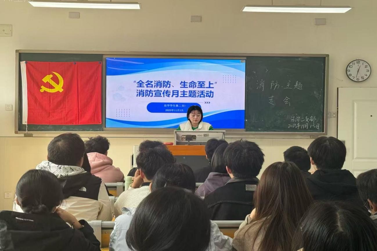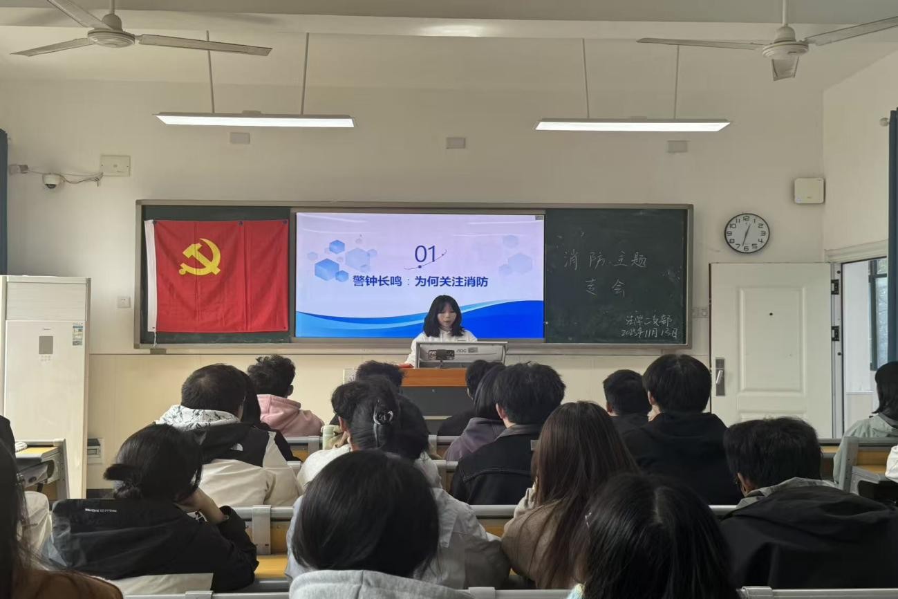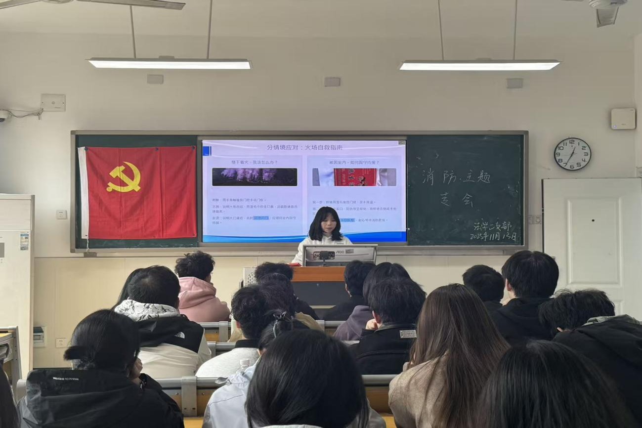 为增强党支部成员消防安全意识,提升火灾防范与应急自救能力,2025年11月13日中午12点,法学学生第二党支部于十二教301开展“全民消防、生命至上”消防主题实践活动。本次活动由支部书记刘玲利主持,副书记宋佳怡主讲,全体支部成员参与。
