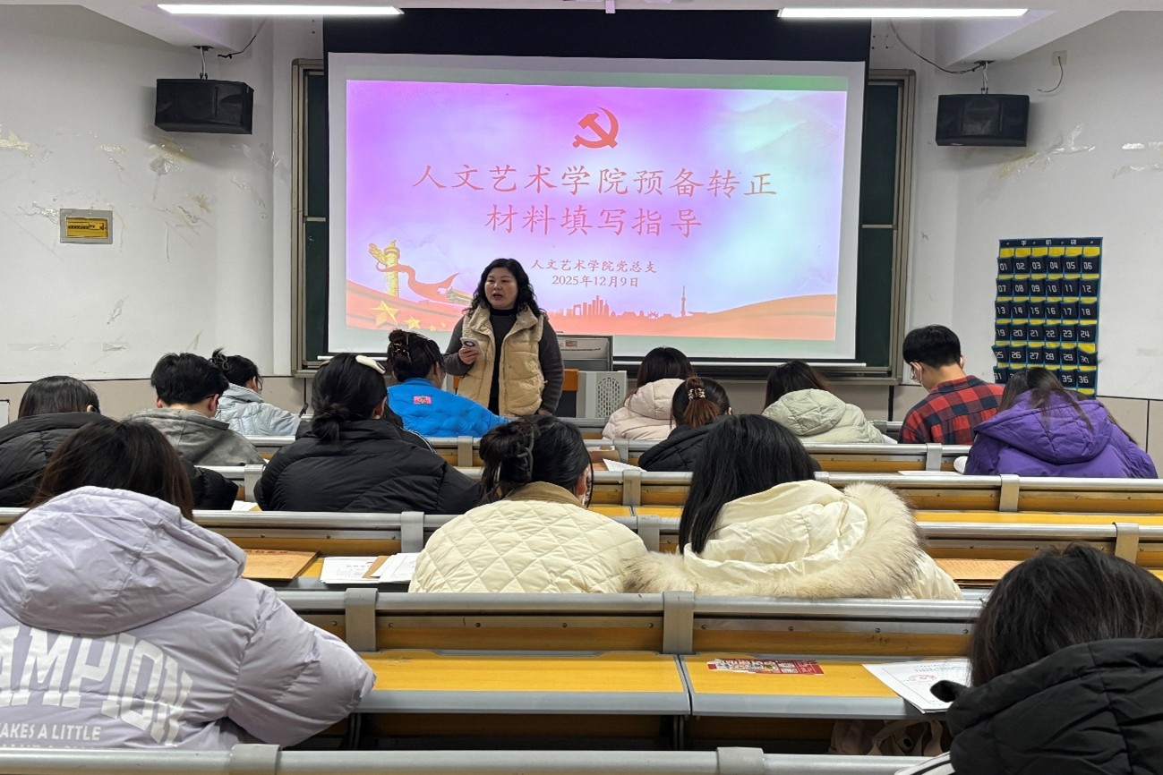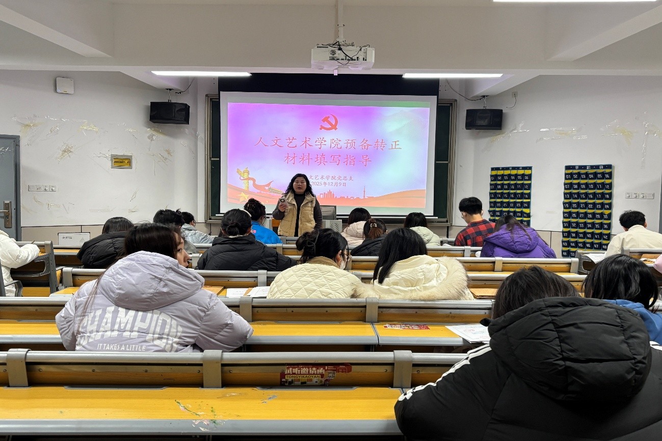 为规范预备党员材料填写流程,强化材料填报的严谨性与规范性,助力预备党员稳步夯实党性修养根基,2025年12月9日晚18:40,人文艺术学院于11教225教室开展预备党员材料填写专项指导会议,此次会议由人文艺术学院党总支副书记许婷婷老师主讲,第20期预备党员准时参会。