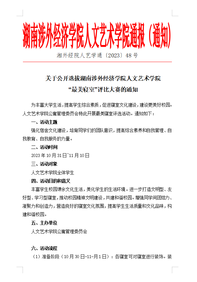 关于公开选拔湖南涉外经济学院人文艺术学院 “最美寝室”评比大赛的通知