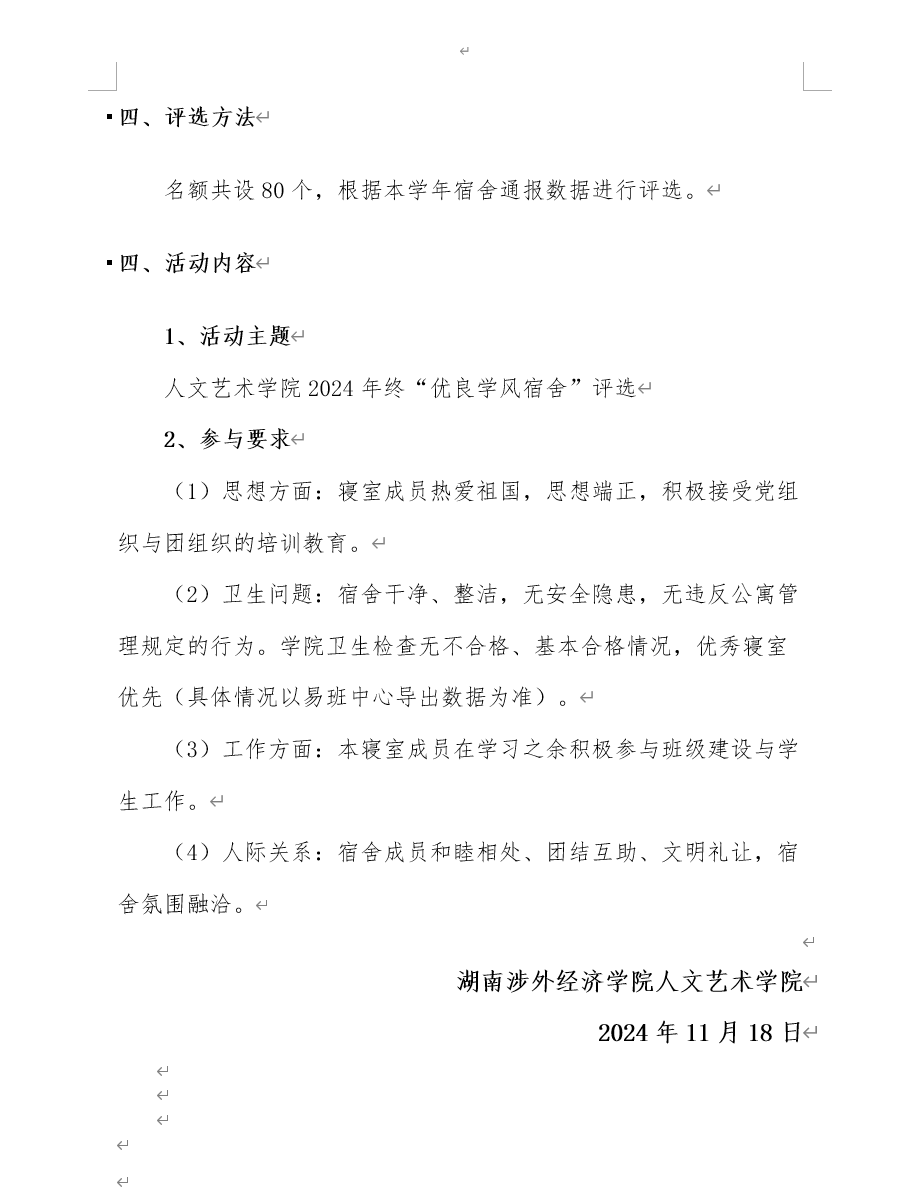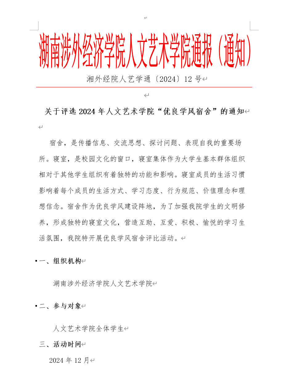 关于评选2024年人文艺术学院“优良学风宿舍”的通知