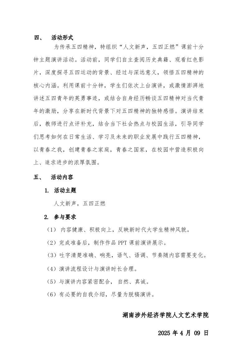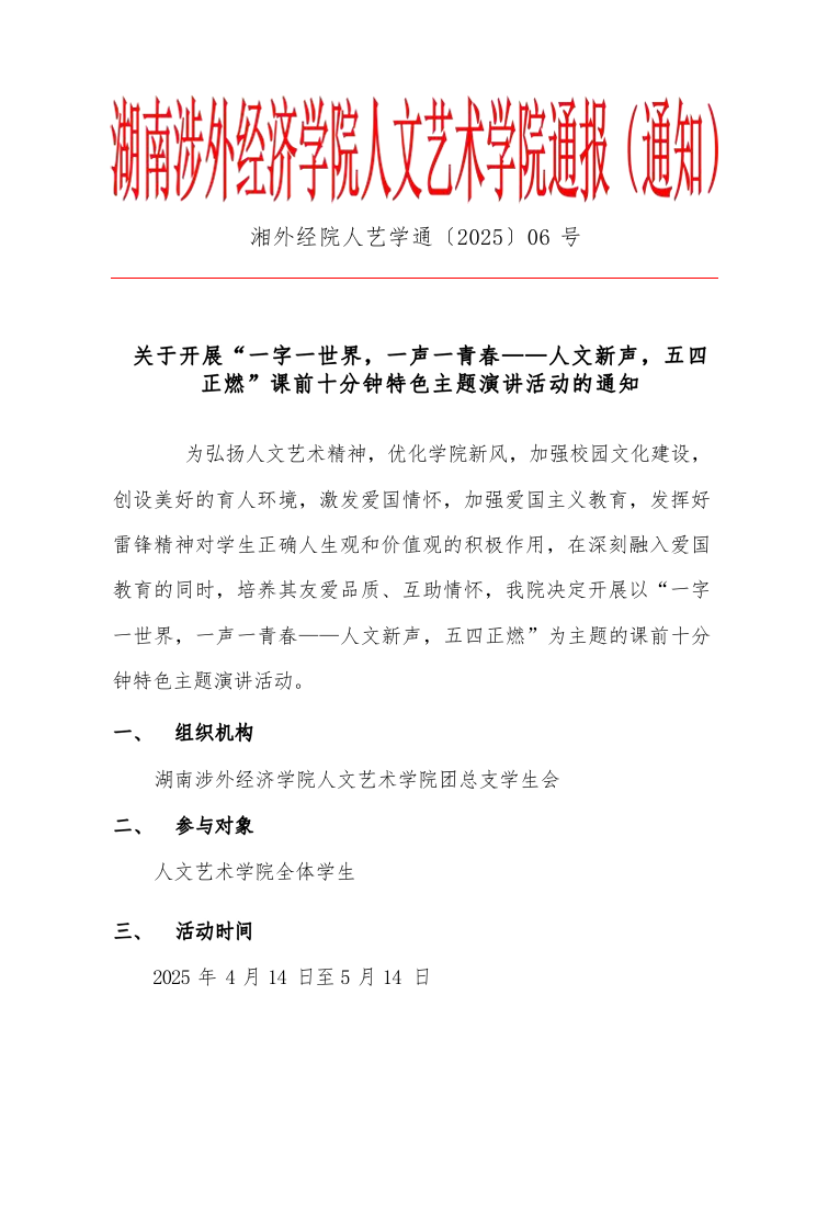 关于开展·一字一世界,一青春一人文新声,五四正燃”课前十分钟特色主题演讲活动的通知