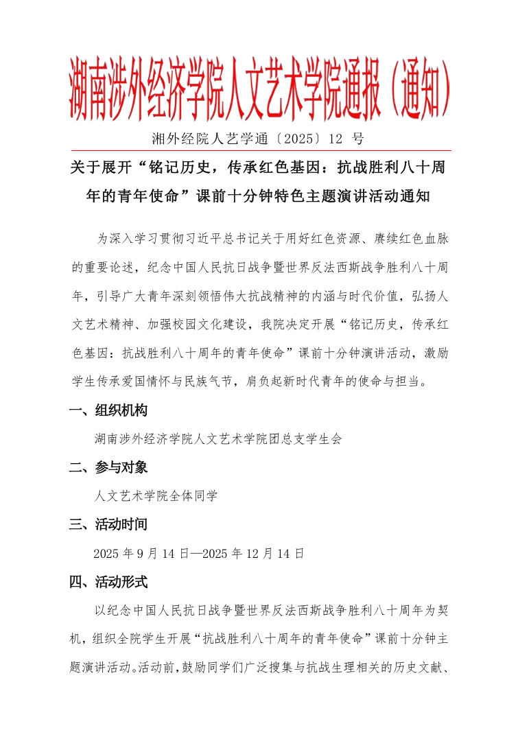 关于展开“铭记历史,传承红色基因:抗战胜利八十周 年的青年使命”课前十分钟特色主题演讲活动通知