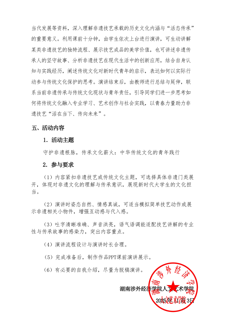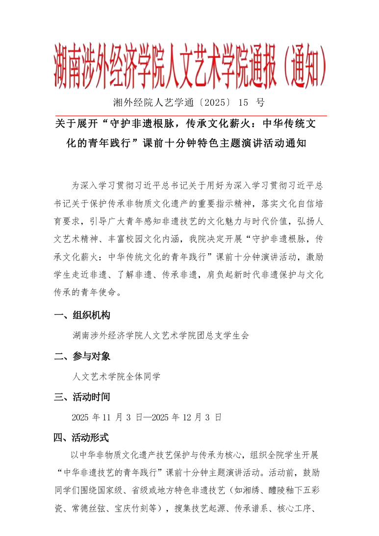关于展开“守护非遗根脉,传承文化薪火:中华传统文 化的青年践行”课前十分钟特色主题演讲活动通知