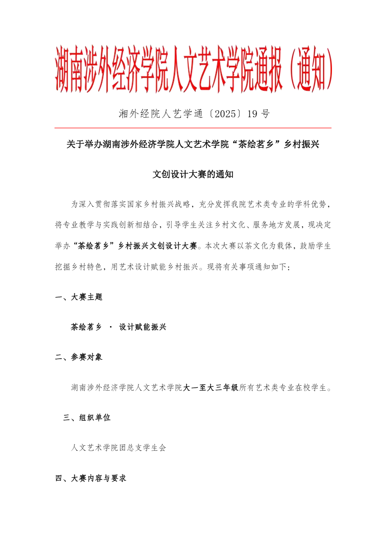 关于举办湖南涉外经济学院人文艺术学院“茶绘茗乡”乡村振兴 文创设计大赛的通知