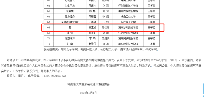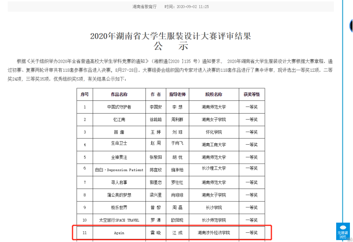 2020年湖南省大学生服装设计大赛中。我院服装与服饰设计专业学生在指导老师的带领下,喜获一等奖1个,二等奖1个,三等奖3个,同时我校荣获此次比赛优秀组织奖。